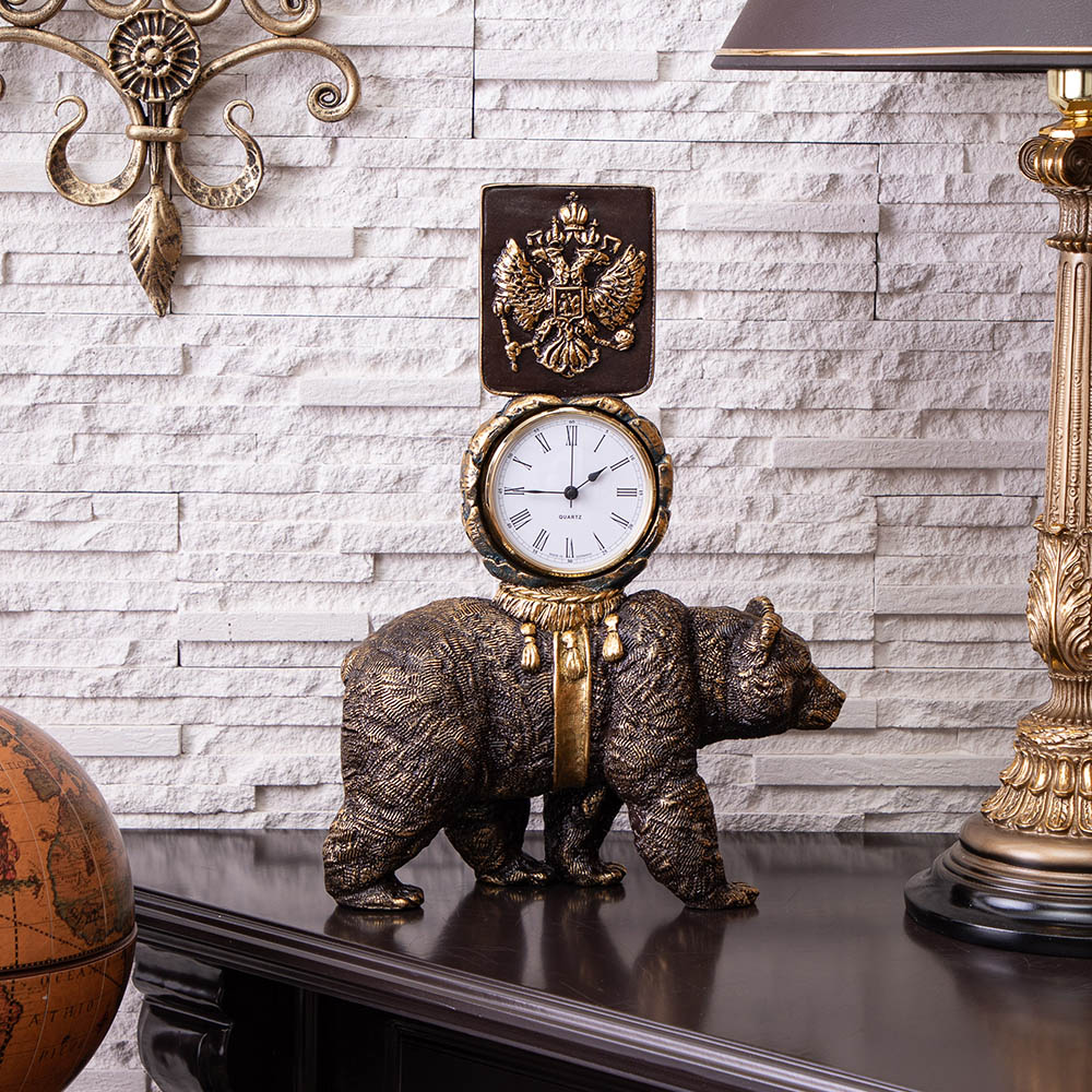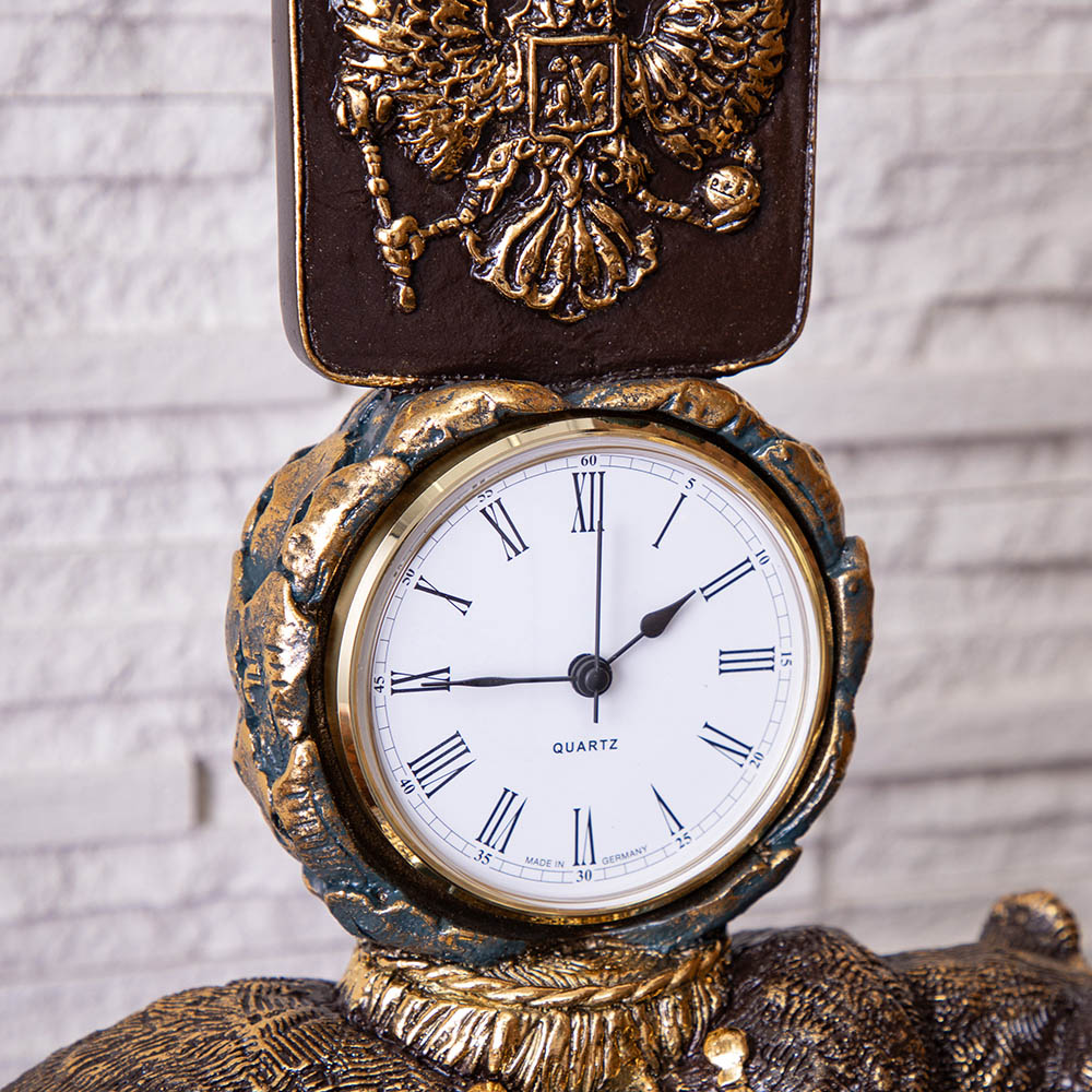 Часы «Держава» — воплощение силы и величия России в изысканном настольном аксессуаре. Могучий медведь и двуглавый орел, возвышающийся над циферблатом, символизируют мощь и вечность русской державы.